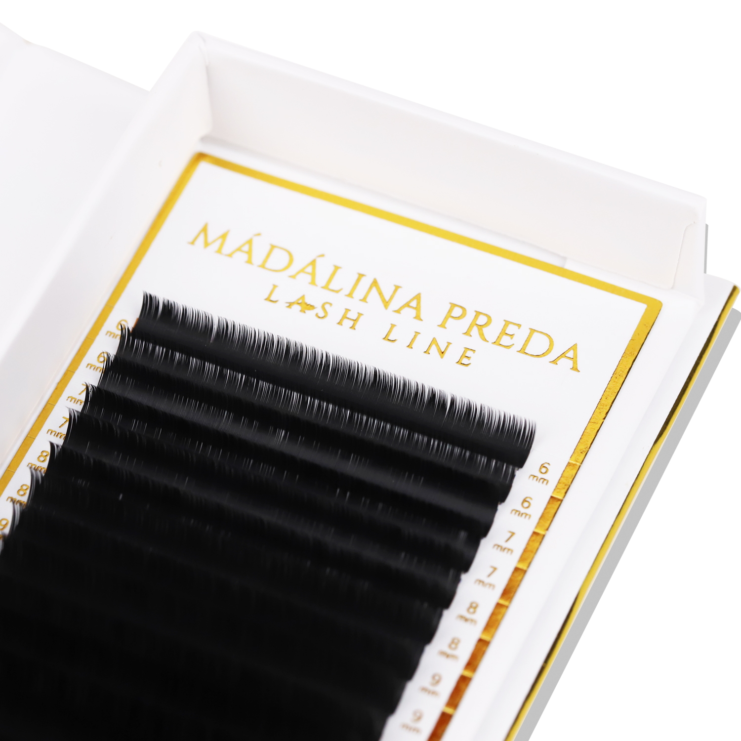 Extensii flat cu textură fină ca mătasea, negru intens și rezistență superioară. Cu 40% mai ușoare decât genele clasice, oferă aderență perfectă și confort la purtare. Setul conține 20 de rânduri, ambalate într-o cutie premium din carton, cu design elegant și profesional.